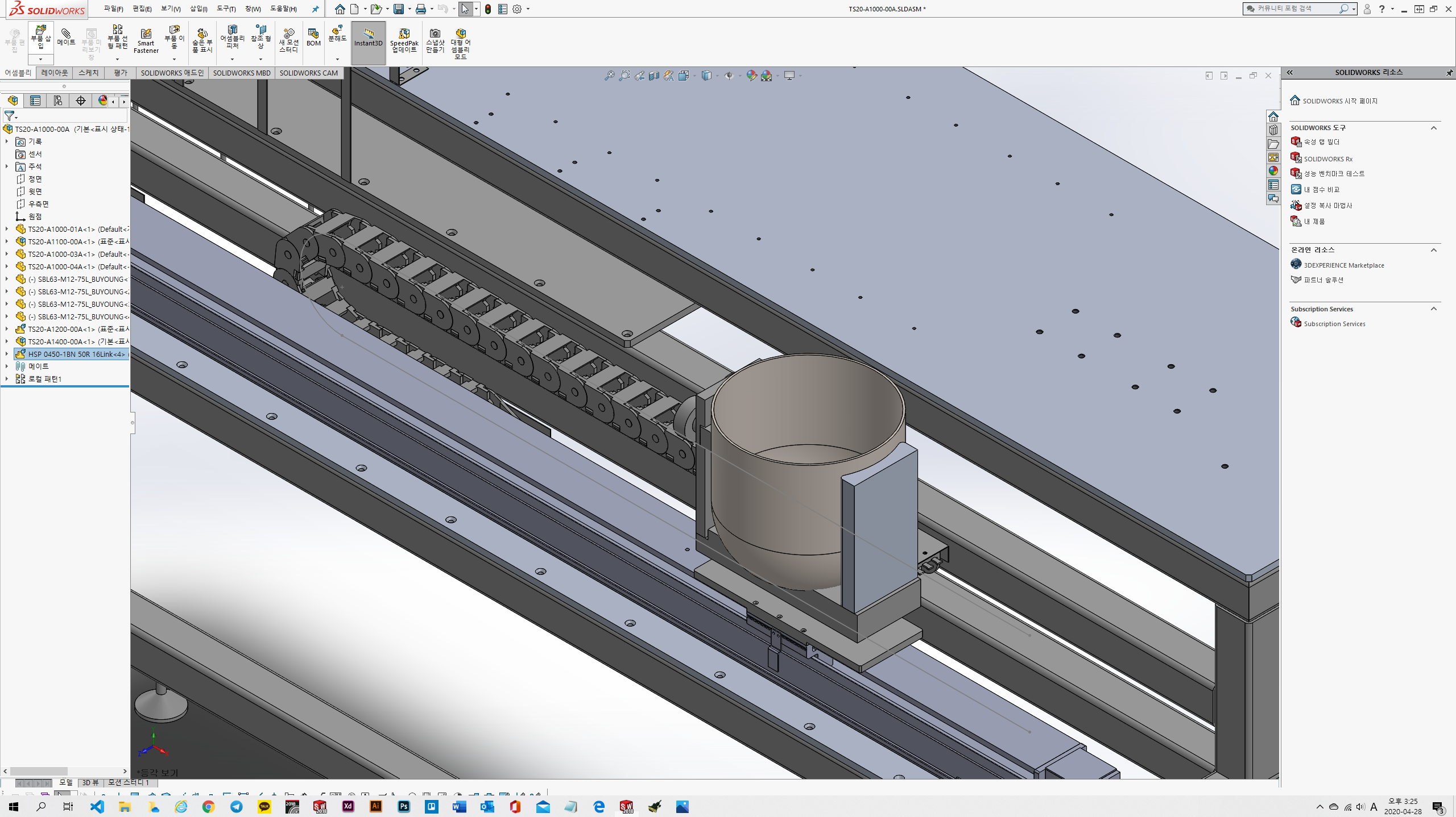 이 장비는 좌우로 움직이는 로봇위의 그릇의 케이블을 감싸야 하기 때문에 로보체인을 사용합니다.